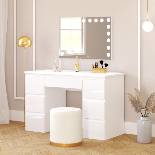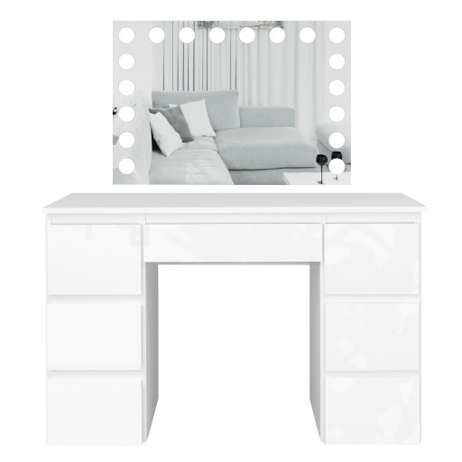 TOALETKA BIAŁY POŁYSK LUSTRO Z OŚWIETLENIEM LEDOWYM LED POJEMNE SZUFLADY