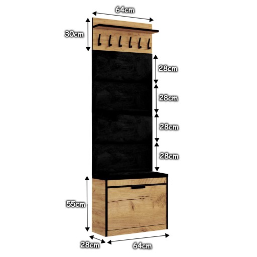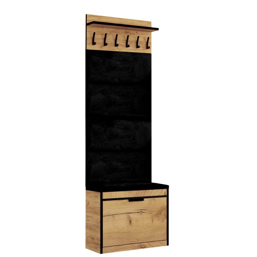 Uchylne komory w szafce pomieszczą wiele par butów, a ukryty pod wygodnym siedziskiem schowek kapcie czy też dodatki jak pasta do butów. Szafka oraz wieszak idealnie wypełnią Twój przedpokój i pomogą w utrzymaniu porządku. Czarna okleina i uchwyty w połączeniu z płytą w kolorze dąb złoty nadadzą Twojemu wnętrzu loftowy charakter. Cztery panele ścienne nadadzą przytulności Twojemu domu, a Ty wygodnie oprzesz się o nie zakładając buty.