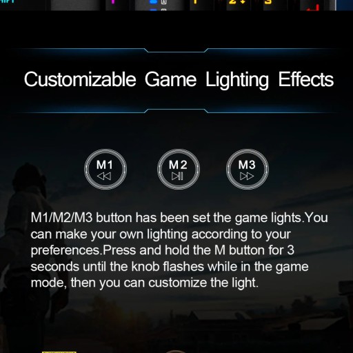 Obróć pokrętło, aby przełączać się między 22 efektami podświetlenia i jasnością oświetlenia. Przyciski M1/M2/M3 mogą ustawić trzy niestandardowe efekty podświetlenia.