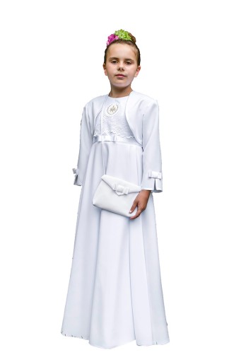 Sukienka uszyta jest ze śnieżnobiałej tkaniny komunijnej gabardyna-strecz .