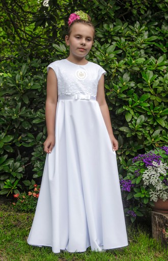Sukienka uszyta jest ze śnieżnobiałej tkaniny komunijnej gabardyna-strecz .
