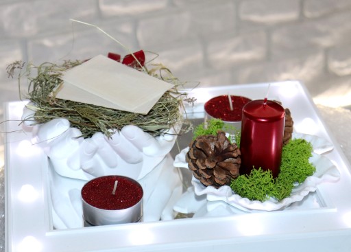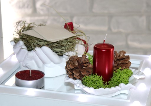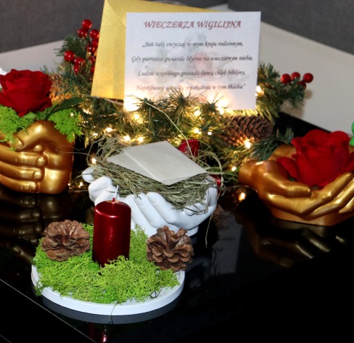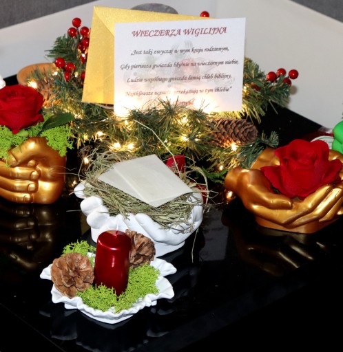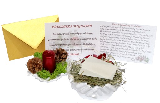 Idealny zestaw na stół wigilijny. Opłatek położony na sianku i podstawce z dłoni gipsowej. Dodatkowo czerwona świeca stojąca na mchu chrobotku wraz z leśnymi szyszkami. W zestawie znajduje się również koperta zawierająca słowa z Ewangelii wg św. Łukasza czytane przed łamaniem się opłatkiem.
