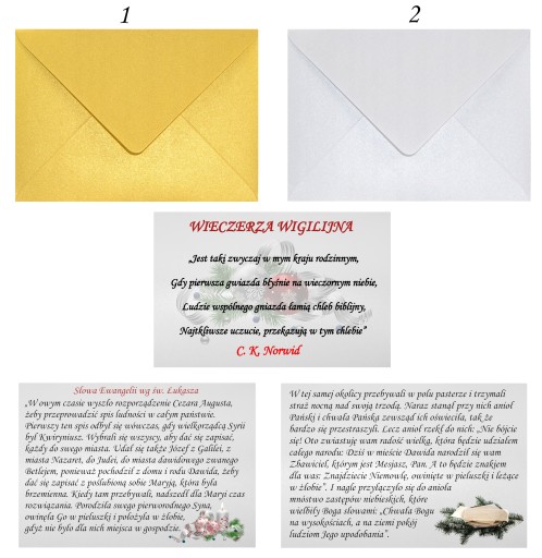- Opłatek Wigilijny (w kopercie z motywem bożonarodzeniowym. Opakowanie zawiera 3 duże [10x18cm] i 2 małe [6x10cm].)