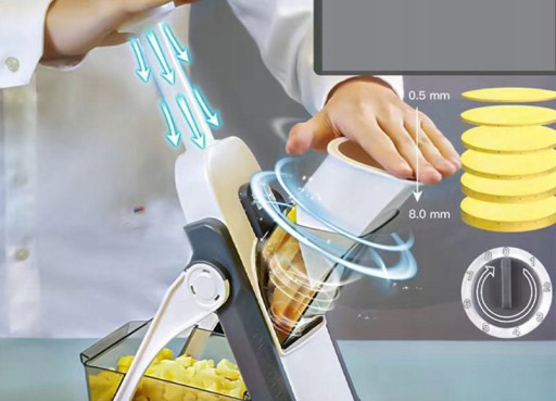 - ✅Ostrze ze stali nierdzewnej kroi warzywa i owoce które wpadają prosto do przezroczystego pojemnika.