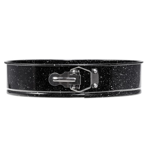 Tortownica 28 cm TOPFANN wykonana została z wysokiej jakości stali węglowej odpornej na wysokie temperatury, korozję i uszkodzenia. Pokryta czarną powłoką z nakrapianym efektem białego granitu o właściwościach nieprzywierających. Gładka powłoka non-stick zmniejsza przywieranie ciasta do ścianek, co zapobiega przypaleniom i ułatwia czyszczenie a stal równomiernie się nagrzewa, dzięki czemu wypieki będą odpowiednio upieczone w każdym miejscu.
