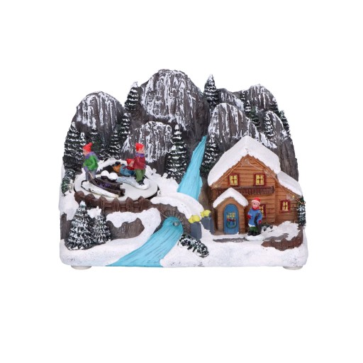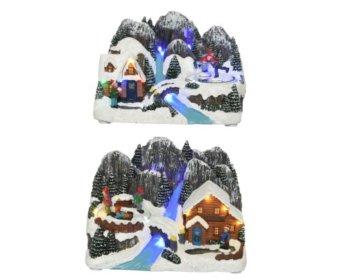 Miasteczko świąteczne w kształcie gór z błękitną rzeką. Do wyboru dwie wersje miasteczka: z domkiem po lewej stronie i łyżwiarstwem figurowym po prawej stronie lub z domkiem po prawej stronie i łyżwiarstwem figurowym po lewej stronie. W obu wersjach łyżwiarze się poruszają. W komentarzu do zamówienia proszę zaznaczyć wybraną wersję, w przeciwnym razie wysyłka losowa. Miasteczko świąteczne jest świetnym pomysłem na podarunek.