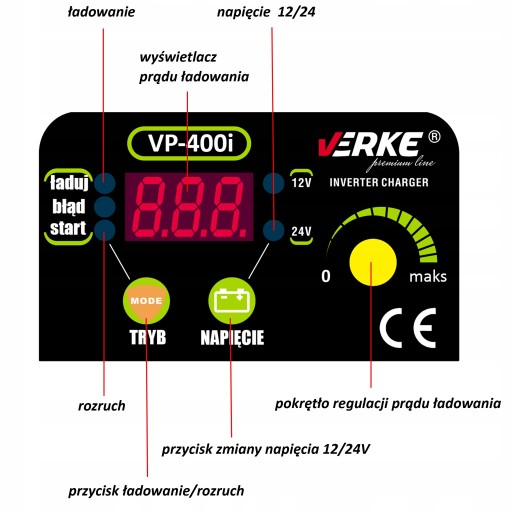 Prostownik inwerterowy VERKE został wyposażony w niezwykle prosty i przejrzysty panel sterowania z wyświetlaczem LED, diodami sygnalizacyjnymi i potencjometrem.