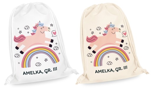 Imienny worek z piękną, modną, kolorową grafiką to idealne rozwiązanie na przechowywanie kapci i ubranek dziecka w żłobku, przedszkolu czy szkole.
