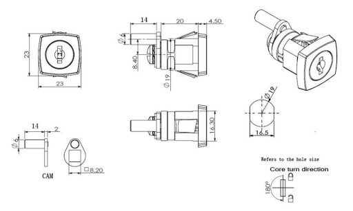 Zamek mocowany zatrzaskowo w otworze, bez użycia śrub. Obrót klucza o 180° powoduję przesunięcie się sztangi odblokowując np. szuflady mebla.
