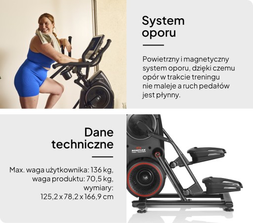 POWIETRZNY SYSTEM OPORU: Prędkość pedałowania przekłada się w czasie rzeczywistym na intensywność ćwiczeń. Oznacza to, że opór w trakcie treningu nie maleje wraz ze wzrostem prędkości, jak jest w przypadku jazdy na zwyczajnym rowerze.