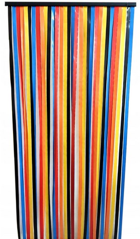 ✅ Zasłona drzwiowa wykonana z pasków z folii PCV, zamocowanych na listwie drewnianej.