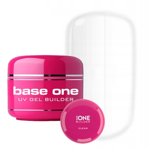 Base One Clear to żel bezbarwny, idealny do budowania paznokcia na tipsie jak i na szablonie. Bez problemów można wtapiać elementy i łączyć z innymi żelami czy akrylami.