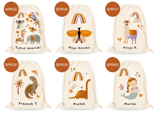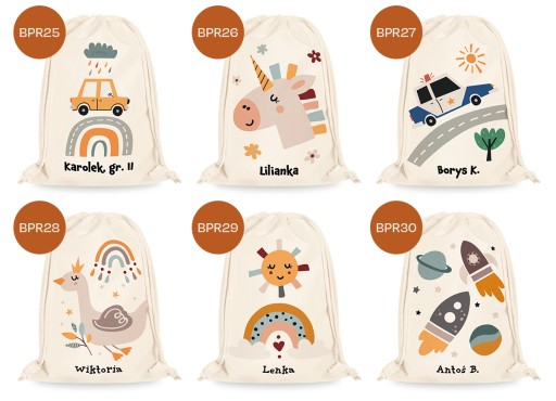 Imienny worek z piękną, modną, kolorową grafiką to idealne rozwiązanie na przechowywanie kapci i ubranek dziecka w żłobku, przedszkolu czy szkole.