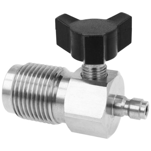 Przetoczka ze standardowym złączem DIN 5/8 cala z gwintem wewnętrznym, który znajduję się przy butlach "matkach". Z drugiej strony zaś szybkozłączka męska oraz manualny odpowietrznik.