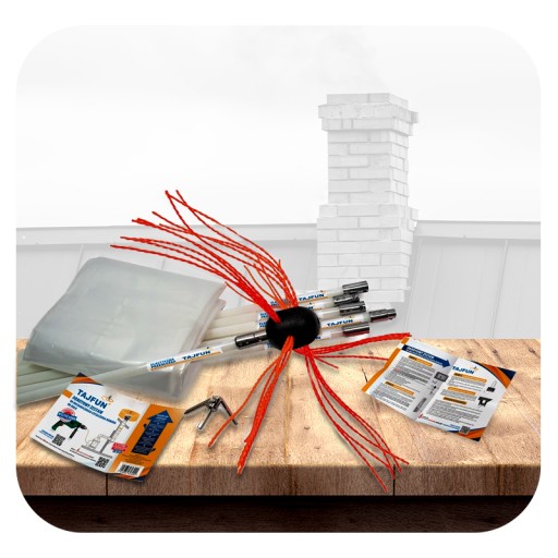 Zestaw Tajfun służy do usuwania lekkich lub umiarkowanych osadów z sadzy i kreozotu w kominach murowanych oraz ceramicznych o dowolnej średnicy, i kształcie.