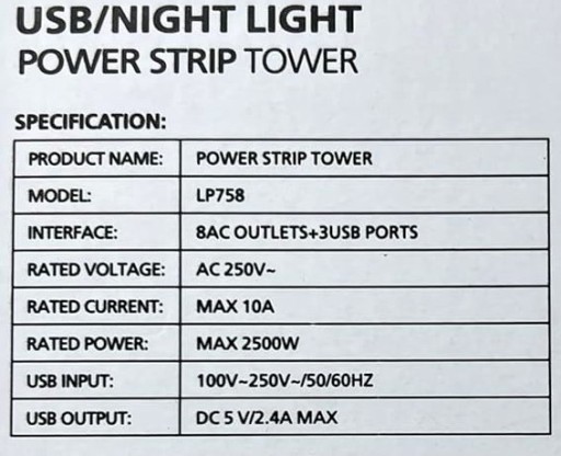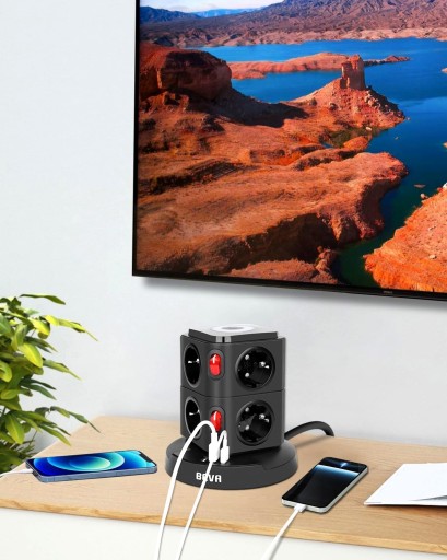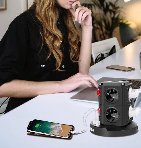 - 8 gniazd UE i 3 gniazda US: Wieża z wieloma gniazdami jest podzielona na dwie warstwy i zasila osobno, 8 gniazd ma 2 przyciski włączania/wyłączania, a każdy przycisk zarządza 4 gniazdami na jednej warstwie. 3 porty USB mogą ładować różne urządzenia. Na przykład laptop, notebook, aparat cyfrowy, PSP itp., aby zaspokoić różne potrzeby w życiu i biurze.