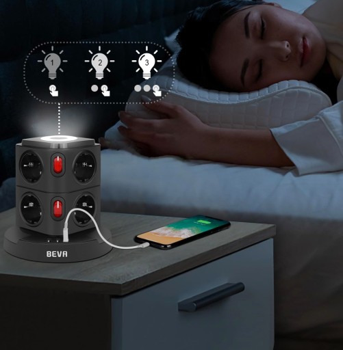 LISTWA ZASILAJĄCA 11w1 RENOMOWANEJ FIRMY BEVA Z ZABEZPIECZANIEM PRZECIW PRZEPIĘCIOWYM ORAZ PRZECIĄŻENIOWYM 8 TRADYCYJNYCH GNIAZDEK + 3 PORTY USB + LAMPKA NOCNA LED Z 3 TRYBAMI ŚWIECENIA
