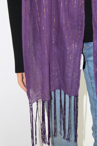 STYLOWY SZAL CHUSTA APASZKA - w kolorze fioletowym, zdobiony złotymi paseczkami, z frędzlami