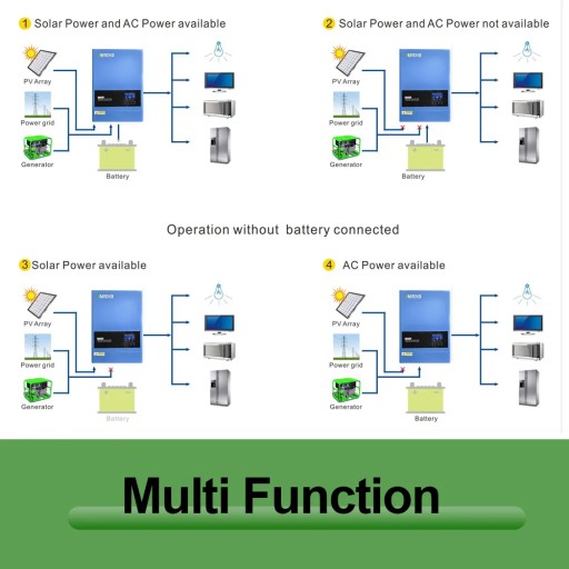 Jednocześnie pozwala na ładowanie akumulatorów za pomocą podłączonych paneli energią słoneczną lub za pomocą wbudowanej ładowarki sieciowej. Działa z panelami PV (jako przetwornica) lub bez, z siecią 230V (jako UPS). Może pracować też bez akumulatorów.