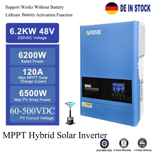 Inwerter może być wyposażony w opcję komunikacji/sterowania przez WiFi oraz BMS do akumulatorów. Jest to wzmocniona, rozszerzona wersja bardzo popularnego inwertera 5000W. Fotowoltaika niskonapięciowa. Praca wyspowa, bez wysyłania prądu do sieci.
