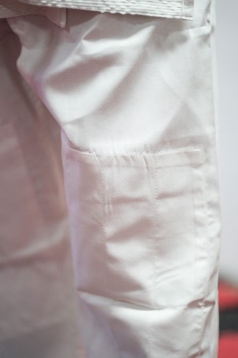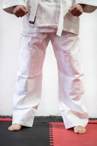 Spodnie są również wykonane ze 100% bawełny i wzmocnione od kolan do samych kostek, zapewniając tym odporność na przetarcia. W pasie zastosowana została guma oraz sznurek. Kimono przed wykurczeniem.