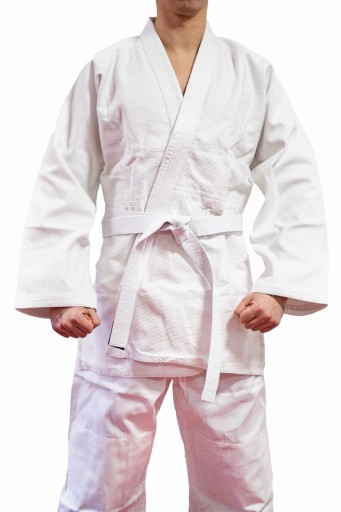 Bluza judogi standard została wykonana z 450g/m2 bawełnianej plecionki, która łączy wytrzymałość i komfort. Struktura plecionki jest odporna na szarpnięcia. Dodatkowo zastosowano wzmocnione szwy dla jeszcze większej odporności materiału. Kołnierz ma średnio-miękką strukturę, która zapewnia komfort i wentylację.