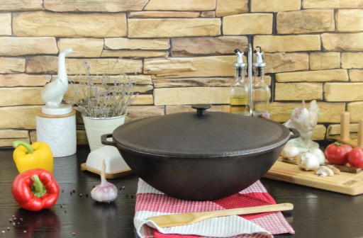 Patelnia żeliwna WOK 8l to naczynie odlane w unikalnej, półkulistej formie. Świetnie nadaje się do gotowania orientalnych przysmaków i nie tylko. Idealnie wysmażysz w niej mięso, ziemniaki, warzywa i przygotujesz aromatyczne, dalekowschodnie dania czy pyszną zupę.