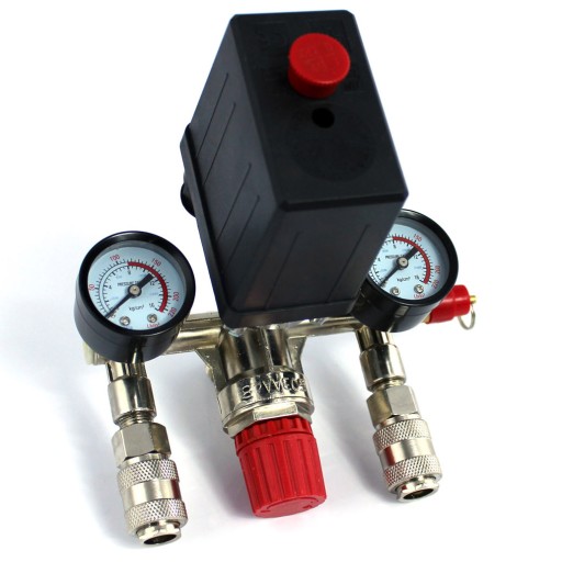 Wyłącznik ciśnieniowy presostat, reduktor 2- zegarowy Wyłącznik/reduktor ciśnieniowy presostat 230V. Pasuje do wiekszości kompresorów dostepnych na polskim rynku. Cechy produktu: dwa manometry ze skalą w jednostkach PSI i BAR dwie szybkozłączki euro kolektor rozdzielczy reduktor z zaworem bezpieczeństwa certyfikaty: CE, TUV ciśnienie maksymalne: 12 bar zasilanie: 230V