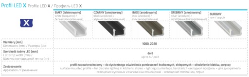 Profil aluminiowy X to profil nawierzchniowy, idealny do dyskretnego oświetlania pomieszczeń kuchennych i sklepowych. Uzyskanie wąskiej linii światła dzięki zastosowaniu profilu X to nie jedyny plus tego produktu. Jego minimalistyczny design pozwala na montaż w miejscach, gdzie nie ma zbyt dużego wyboru, co do zastosowania odpowiedniego oświetlenia. Niewielka wysokość tego profilu i płaska przesłonka (montowana od góry na wcisk) sprawiają wrażenie bardzo dyskretnej oprawy do taśm i listw LED. Idealnie nadaje się do podświetleń dekoracyjnych w meblarstwie oraz wykończeniach wnętrz. Zastosowanie profilu X gwarantuje uzyskanie niezwykle wąskiego i przyjemnego strumienia światła.