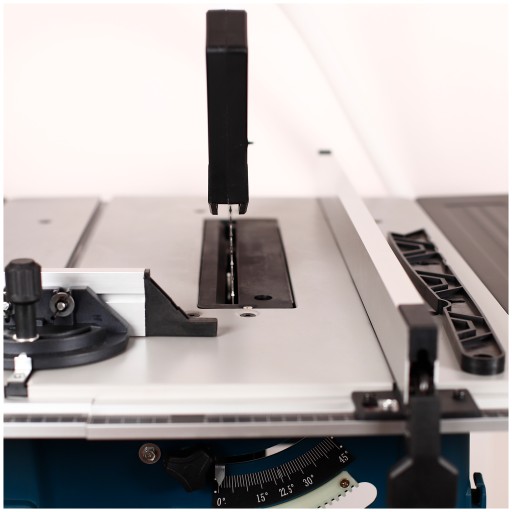 Dzięki prowadnicy bocznej , możliwe jest przecinanie desek na określoną szerokość. Prezentowana przez nas pilarka zamontowana jest na aluminiowym stole, opartym na stabilnych nogach.