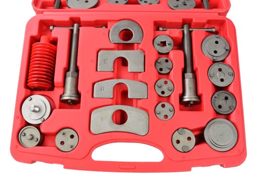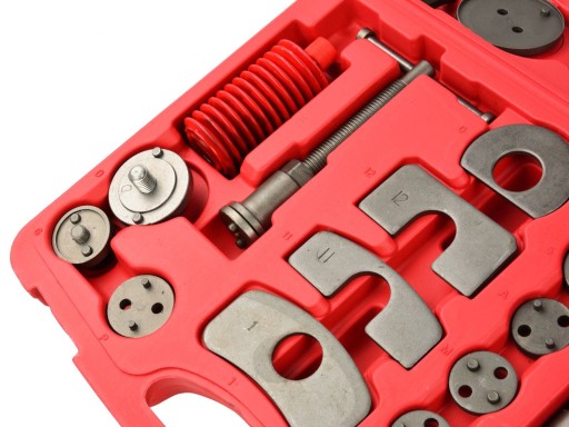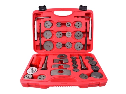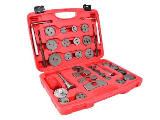Profesjonalny 35-elementowy zestaw do cofania / wyciskania tłoczków hamulcowych, niezbędny przy naprawach pojazdów wyposażonych w hamulce tarczowe. Zestaw pasuje do większości aut na rynku: Audi, Fiat, Ford, Isuzu, Honda, Jaguar, BMW, Mercedes Benz, Mitsubishi, Nissan, Toyota, Renault, Volvo, Citroen, Opel, SAAB, GM i VW Elementy zestawu olej do gwintów prasa prawoskrętna z magnetycznym mocowaniem prasa lewoskrętna z magnetycznym mocowaniem klucz hex 6 mm i klucz hex 7 mm 23 x adaptery dostosowane do wielkości tłoczków hamulcowych 1 x adapter na kwadrat 3/8” do dokręcania kluczem grzechotkowym 2 x wybijak do rozluźniania sworznia 4 x wymienna płyta mocująca