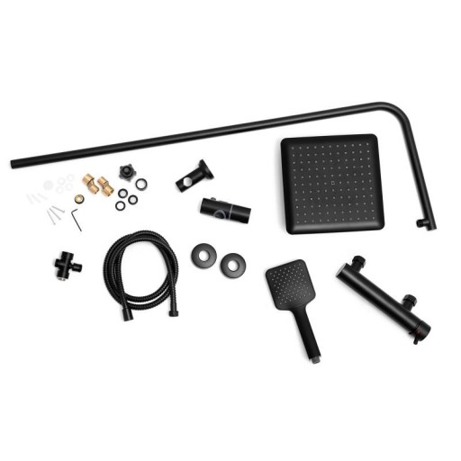 W zestawie bateria prysznicowa z mieszaczem temperatury, regulacją i przełącznikiem strumienia wody między deszczownicą, a słuchawką. Ceramiczna głowica baterii (35 mm) gwarantuje trwałość i wytrzymałość. Zestaw zawiera stylową deszczownicę o wymiarach 23 x 23 cm oraz słuchawkę prysznicową w czarnym, matowym kolorze - obydwa elementy z nowoczesnym systemem ANTI-CALC. Design zestawu został podporządkowany najnowszym trendom - prezentuje się niezwykle elegancko i idealnie pasuje do nowocześnie urządzonej łazienki.