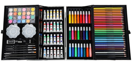 24 akwarele, 24 farbki temperowe, 24 pastele woskowe, 28 kredek, 33 pisaki, 2 ołówki, 2 gumki, 2 kubki, 4 pędzle, ostrzałka.