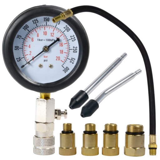 Tester do kontroli ciśnienia sprężania w cylindrach silników benzynowych z wyposażeniem poszerzającym jego możliwości.