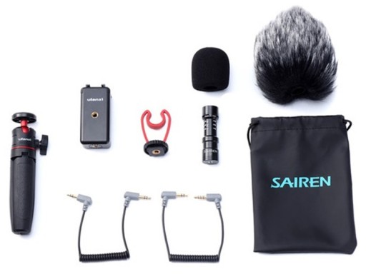 Statyw / uchwyt MT-08, mikrofon Kierunkowy SAIREN VM-Q1, uchwyt Ulanzi ST-07, Kabel typu skrętka Mini Jack 3.5 mm TRS – TRRS, Kabel typu skrętka Mini Jack 3.5 mm TRS – TRS, Zaawansowane mocowanie antywstrząsowe, Osłona przeciwwietrzna typu deadcat - "futrzak", Osłona przeciwwietrzna typu gąbka, Futerał ochronny.