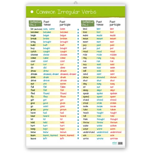 Plakat edukacyjny formatu A1 prezentujący listę popularnych angielskich czasowników nieregularnych wraz z ich specyficzną formą II (past tense) oraz III (past participle).