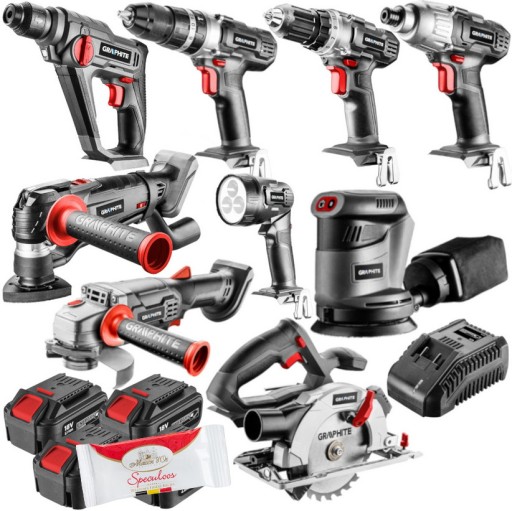 Zestaw elektronarzędzi akumulatorowych marki GRAPHITE, zestaw zawiera: MŁOTOWIERTARKA SDS+ 58G009, ZAKRĘTARKA 58G012, SZLIFIERKA MIMOŚRODOWA 58G014, PILARKA TARCZOWA 58G008, LATARKA 58G007, SZLIFIERKA KĄTOWA 58G003, WIERTARKO-WKRĘTARKA 58G000, WIERTARKO-WKRĘTARKA 58G010, URZĄDZENIE WIELOFUNKCYJNE 58G013, ŁADOWARKA 58G002, 4 x AKUMULATOR 4AH 58G004