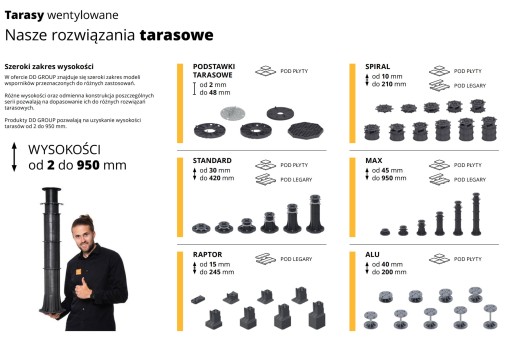 Posiadamy bardzo szeroki wybór elementów SYSTEMU TARASOWEGO do montażu płytek tarasowych lub legarów z przeznaczeniem do różnych zastosowań i przypadków technicznych: