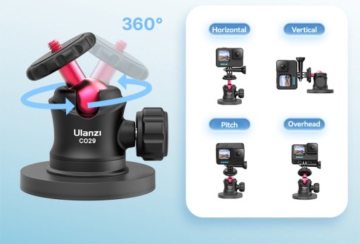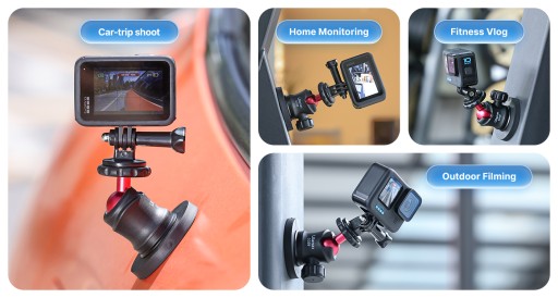 Głowica idealnie nadaje się do mocowania kamer sportowych i telefonów komórkowych. Aby zamocować telefon należy zastosować dodatkowy, standardowy uchwyt na gwint 1/4''. Z kolei do zamocowania kamery sportowej niezbędne elementy znajdziemy w zestawie.