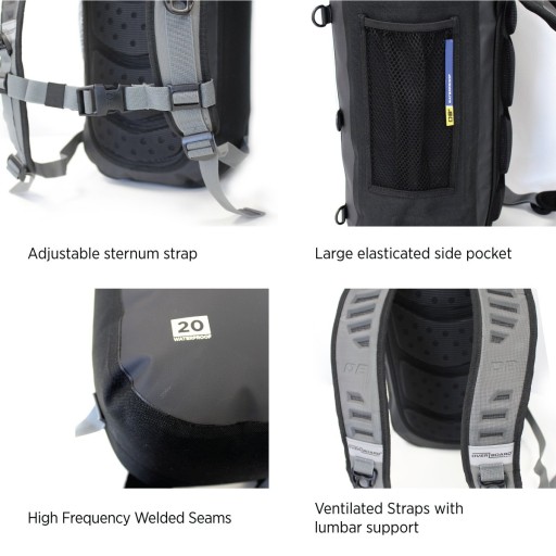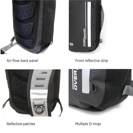 100% wodoszczelny plecak – klasa 3: IP66. Chroni zawartość przed kurzem, piaskiem, brudem i wodą. Konstrukcja spawana o wysokiej częstotliwości. 2-drożny system uszczelnienia (tradycyjna górna lub boczna kompresja). Wewnętrzna kieszeń na akcesoria z zamkiem błyskawicznym – wys.: 25 cm x szer.: 21 cm. Wyściełane paski na ramiona z odblaskowymi naszywkami, wygodna część tylna z designem Air-Flow. Regulowane pasy biodrowe. Duża, elastyczna kieszeń boczna z siatki. Elastyczny pasek z przodu. Odblaskowa naszywka z przodu. Górny uchwyt do noszenia.