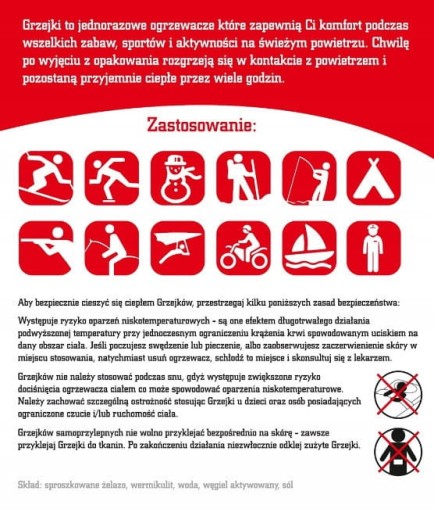 Ogrzewacze będą przydatne także w innych okolicznościach np. na spacerze z dzieckiem w wózku czy na sankach, a nawet podczas noclegu w terenie - umieszczone wewnątrz śpiwora wytworzą komfortową temperaturę. Mogą być stosowane przy dolegliwościach artretycznych i reumatycznych.