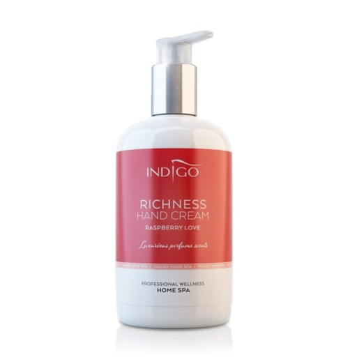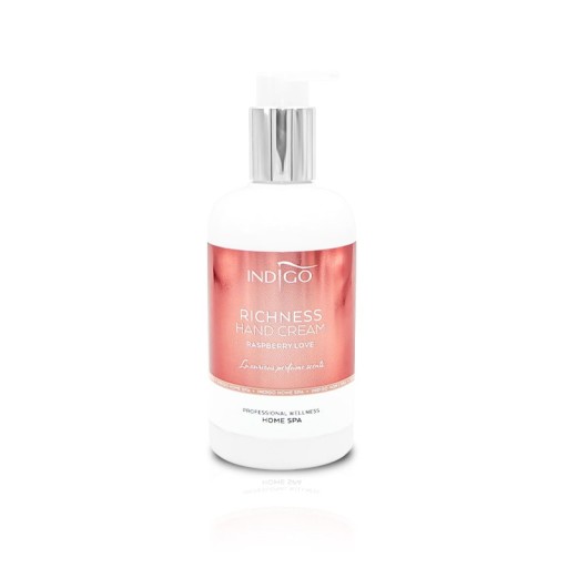 Indigo Krem do rąk Raspberry Love 100ml. Efekt idealnego nawilżenia skóry, lekka konsystencja i kuszący zapach malin, który pozwoli Ci się odprężyć. Nawilżająca formuła, oparta na połączeniu oleju ze słodkich migdałów, masła shea, masła kakaowego, gliceryny i witaminy E. Produkt idealny do codziennej pielęgnacji i jako uzupełnienie zabiegów manicure w domu i w salonie kosmetycznym.