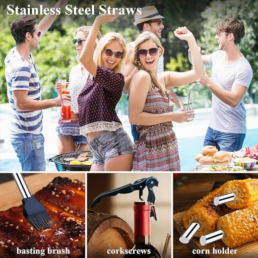 - [NIEZBĘDNE AKCESORIA DO GRILLA] -------- Niezbędny zestaw startowy dla miłośników grillowania. Ten zestaw do grillowania zawiera wszystko, czego potrzebujesz do grillowania: 1 * szczypce z długą rączką, 1 * uniwersalną szpatułkę, 1 * widelec do grilla, 1 * szczotkę do ciasta, 1 * szczotkę do grilla ze skrobaczką, 1 * dodatkową główkę szczoteczki, 1 * termometr błyskawiczny , 1 * korkociąg, 4 x szaszłyki do grilla, 8 x pojemniki na kukurydzę, 1 x zestawy słomek wielokrotnego użytku (2 x tęczowa słomka, 2 x srebrna słomka, 1 x szczoteczka do czyszczenia słomy), 1 x aluminiowa obudowa