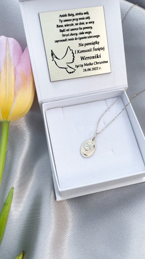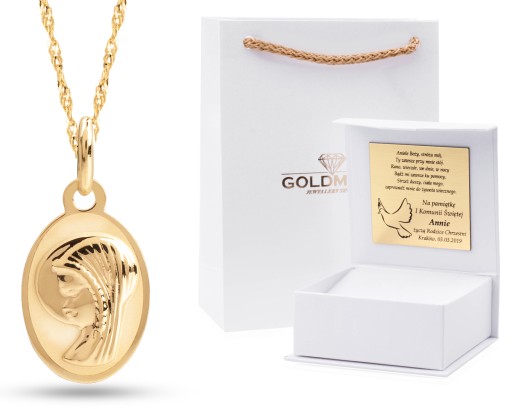 Złoty komplet, medalik z łańcuszkiem w całości wykonane ze złota próby 333. Zestaw idealnie nadaje się na takie okazje jak Chrzest Święty lub Komunia Święta. Dzięki bezpłatnemu grawerunkowi prezent stanie się jeszcze bardziej indywidualny. Biżuteria oferowana przez nas jest najwyższej jakości. Zdjęcia są naszego autorstwa, przedstawiają dokładnie ten produkt, który kupujesz! Do każdego zakupu otrzymasz gratis wybrane pudełko wraz z grawerunkiem. Możliwość wykonania dedykowanego napisu na wybranych medalikach.