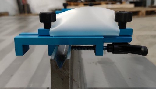 Folię umieszcza się na matrycy dzięki temu eliminujemy kontakt giętego detalu z matrycą poprzez umieszczenie „ pośrednika”. W wyniku czego oczekuje się redukcję/brak śladu od strony matrycy zaznaczony na szkicu w tej ofercie. Montaż próbki jest bardzo szybki używając np. magnesów bądź uchwytów.