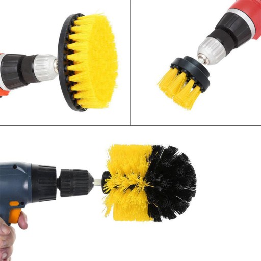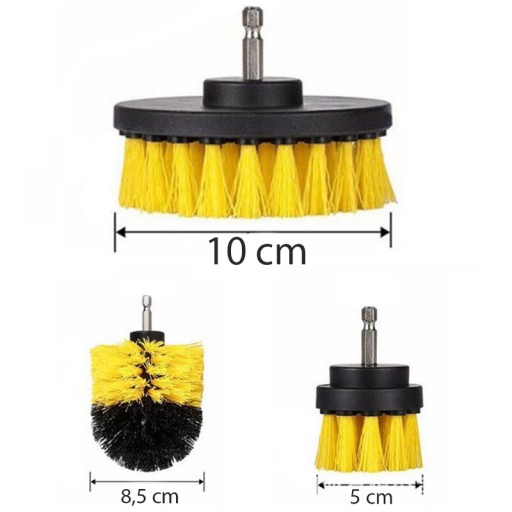 Zestaw do sprzątania składa się, aż z trzech szczotek czyszczących o różnym kształcie i różnych średnicach takich jak: 5, 8.5 i 10 cm, dzięki temu są bardzo praktyczne w zastosowaniu. Różnorodność końcówek sprawia, że pasują one do czyszczenia toalety, umywalki, kabiny prysznicowej oraz wanny. Końcówka o dużej średnicy sprawdzi się przy czyszczeniu podłóg, szafek, a także pokrowców lub tapicerki w aucie. Dzięki mniejszej końcówce wyczyścimy fugi oraz felgi samochodowe.