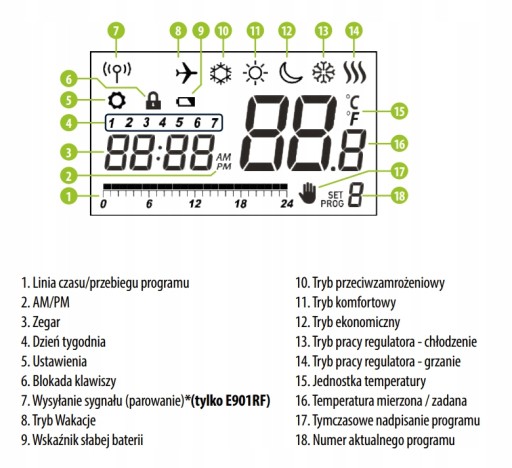 E901RF to natynkowy regulator pokojowy, służący do bezprzewodowego sterowania urządzeniami oraz systemami grzewczymi lub chłodzącymi. Jego działanie polega na utrzymywaniu komfortowych warunków w pomieszczeniu, zgodnie z harmonogramami pracy lub nastawioną przez użytkownika stałą temperaturą. Regulator jest fabrycznie sparowany z odbiornikiem. Odbiornik podłącza się np. do kotła.