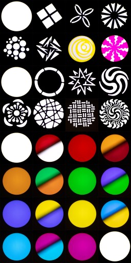 - Dwie tarcze gobo: Rotacyjna 7 GOBO + OPEN, Statyczna 7 GOBO + OPEN
