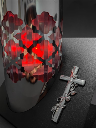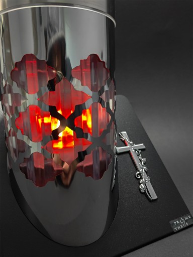 Wspaniały, nowoczesny znicz solarny wykonany z metalu. Tuba z wyciętymi zdobieniami została wykonana z wysokojakościowej stali. Wewnątrz znajduje się karbowana tuba wykonana z bezbarwnego tworzywa, która dodatkowo rozprasza światło wkładu LED zasilanego przez panel solarny.