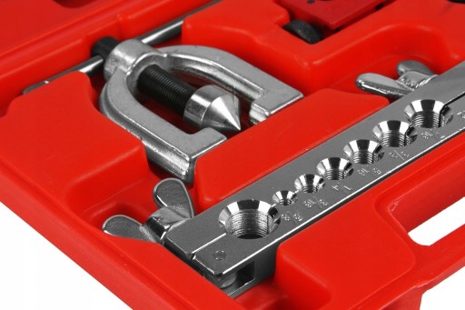 Dodatkowo, zestaw zawiera matrycę z otworami o średnicy 3/16", 1/4", 5/16", 3/8", 7/16", 1/2" oraz 5/8". Praska stożkowa, wyposażona w końcówkę do rozszerzania o kąt 45°, zapewnia precyzyjne i skuteczne działanie.